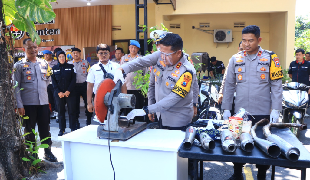 NGAWI,SARANAWARTA.COM – Menjelang pergantian tahun 2023 – 2024, sebanyak 176 knalpot brong dimusnahkan dengan cara dipotong menggunakan mesin gerinda