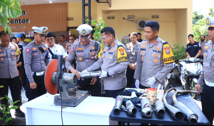 NGAWI,SARANAWARTA.COM – Menjelang pergantian tahun 2023 – 2024, sebanyak 176 knalpot brong dimusnahkan dengan cara dipotong menggunakan mesin gerinda